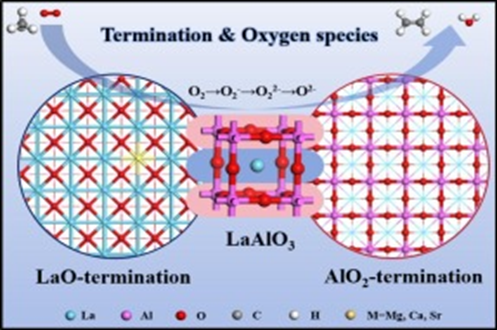 图为 LaAlO₃催化剂在甲烷氧化偶联(OCM)反应中的表面结构、氧物种演化及催化性能关联示意图。图中展示了 LaAlO₃的两种典型表面终止相:左侧为 LaO - 终止相,右侧为 AlO₂- 终止相,中间为 LaAlO₃体相结构(彩色球分别代表 La、Al、O 等元素)。示意图直观呈现了氧物种在不同终止表面的演化路径:在 LaO - 终止表面,氧物种按 O₂→O₂⁻→O₂²⁻→O⁻的路径演化;在 AlO₂- 终止表面,氧物种则遵循 O₂→O₂⁻→O₂²⁻→O²⁻的路径演化。其中超氧物种 O₂⁻是甲烷解离的关键活性氧物种。研究表明,LaO - 终止相因具备更高的 CH₄解离活性、C₂H₄生成活性及选择性,成为主导活性终止相;而碱土金属(Mg、Ca、Sr)掺杂虽未改变氧物种类型,但可显著调控反应特性,且表面 O₂⁻的 Bader 电荷可作为预测 M/LaO-p-O₂⁻催化剂甲烷解离能力的有效描述符。